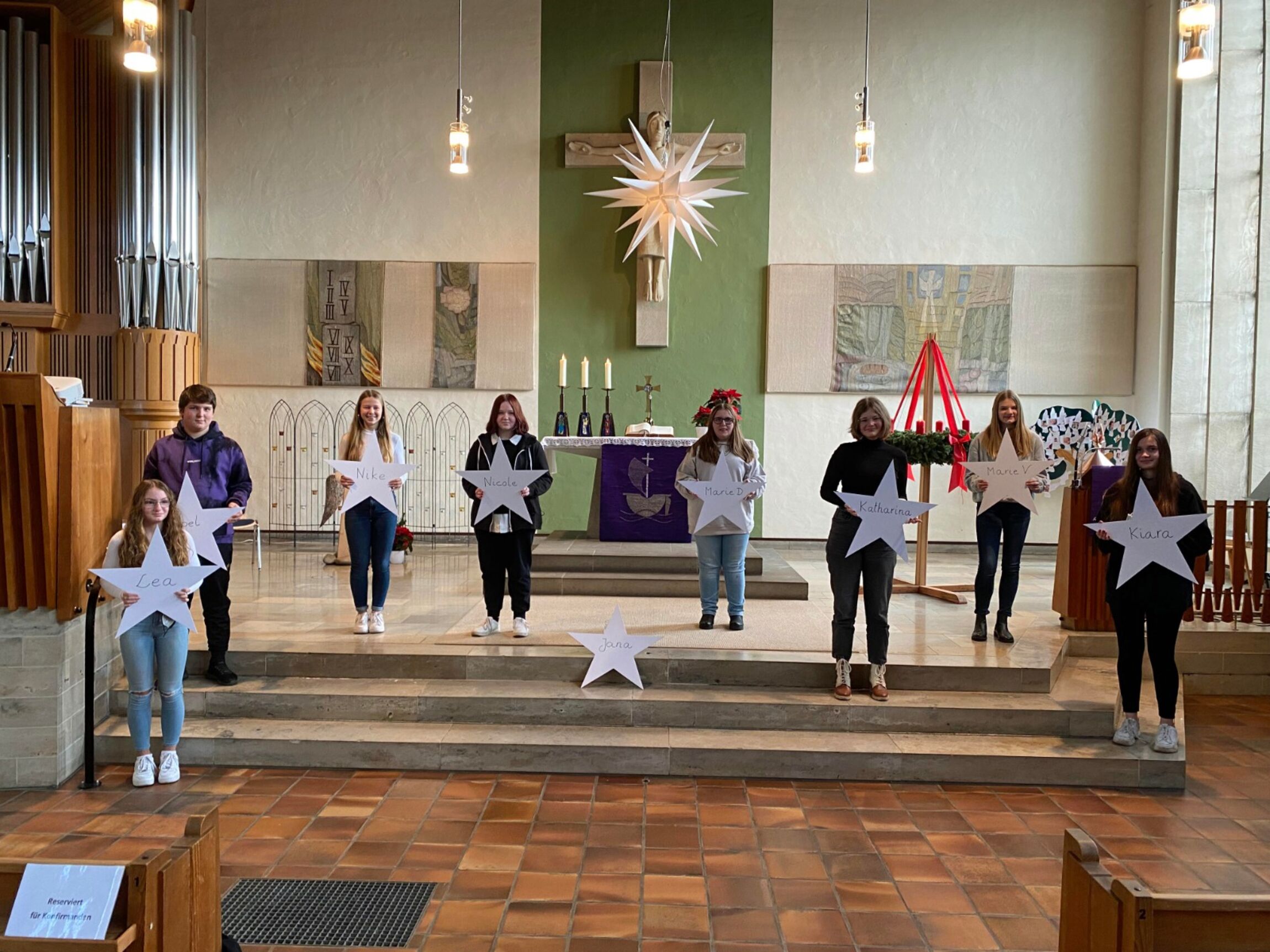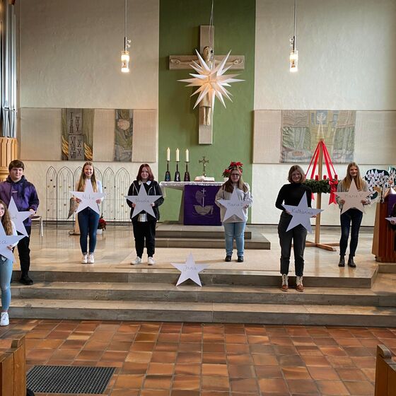 Aber leider machte uns die Entwicklung der Inzidenzwerte einen Strich durch die Rechnung. Somit musste alles neu überdacht und Corona konform umgesetzt werden. Zum Gottesdienst musste man sich wieder anmelden. Die Konfirmandinnen und der „Quoten“- Konfirmand konnten vorgestellt werden. Auf dem Gemeindegesang musste verzichtet werden, im gesamten Gottesdienst mussten die Mund-Nasen-Masken getragen werden. Pastor Joost und Ehepaar Völkner übernahmen zu Gitarre und Orgelbegleitung durch Frau Brungs den Gemeindegesang. Das Hauptthema des Gottesdienstes war der Stern, mit seinen unterschiedlichsten Bedeutungen. Auch Jesus war so ein Stern, der das Licht in die Welt gebracht hat.