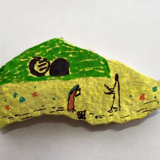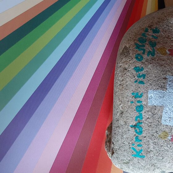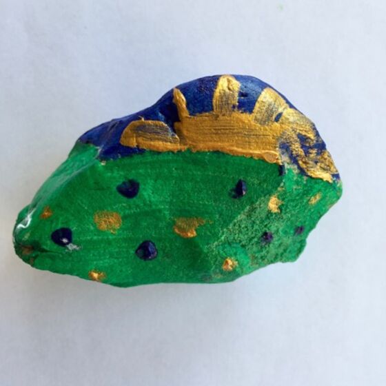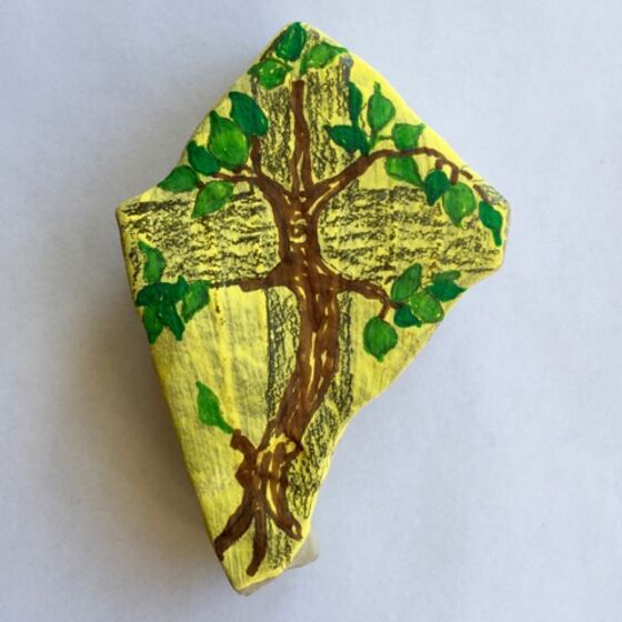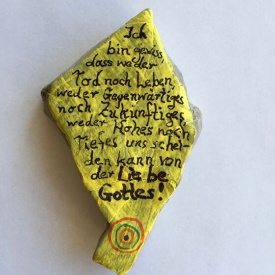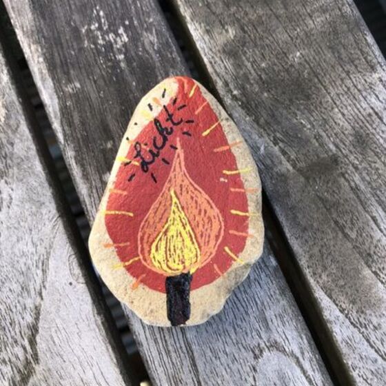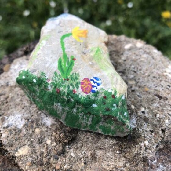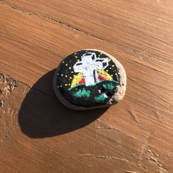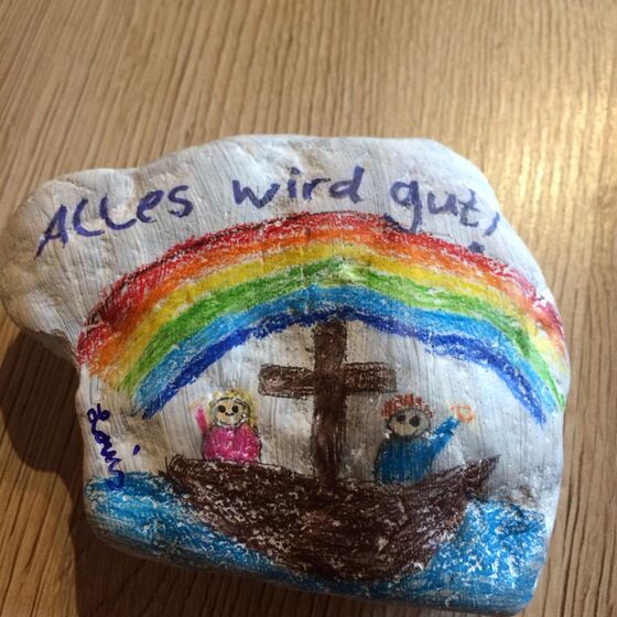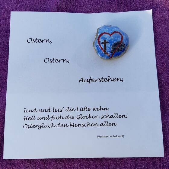 Dann den Stein mit einem Zeichen der Hoffnung bemalen! Das kann ein Kreuz sein, ein Regenbogen, ein ermutigendes Wort, ... was euch/Ihnen so einfällt! Auf die Rückseite eine Osterbotschaft schreiben
